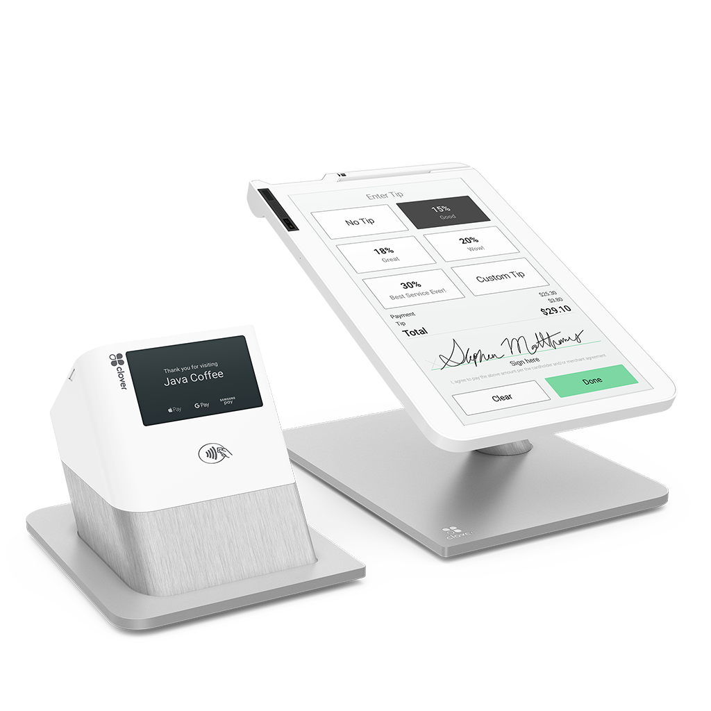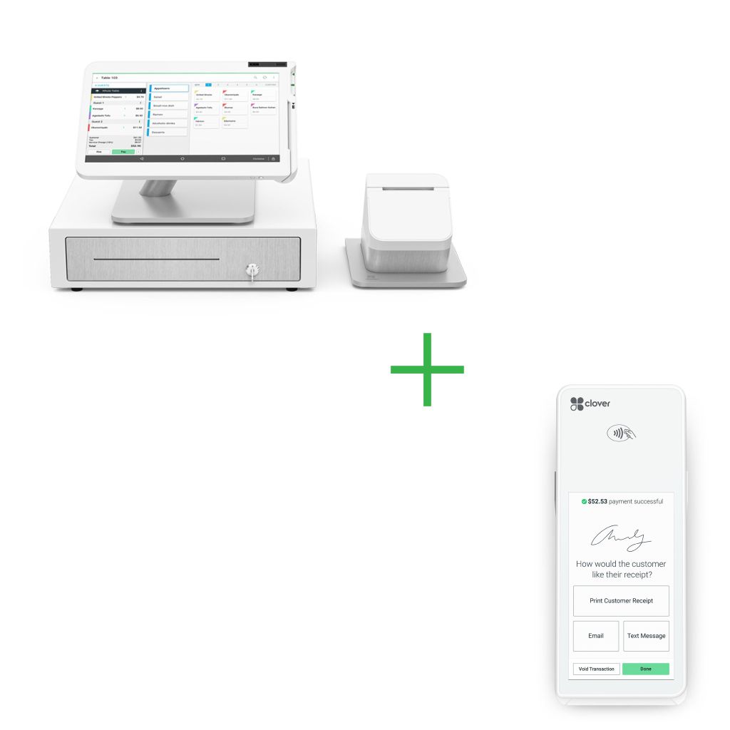Perfect for a large, busy restaurant. Do it all with the Clover Dining powerhouse duo: Station and Flex. Customize your floorplan on Station, take tableside orders and payments with Flex—and just about everything else with either device.