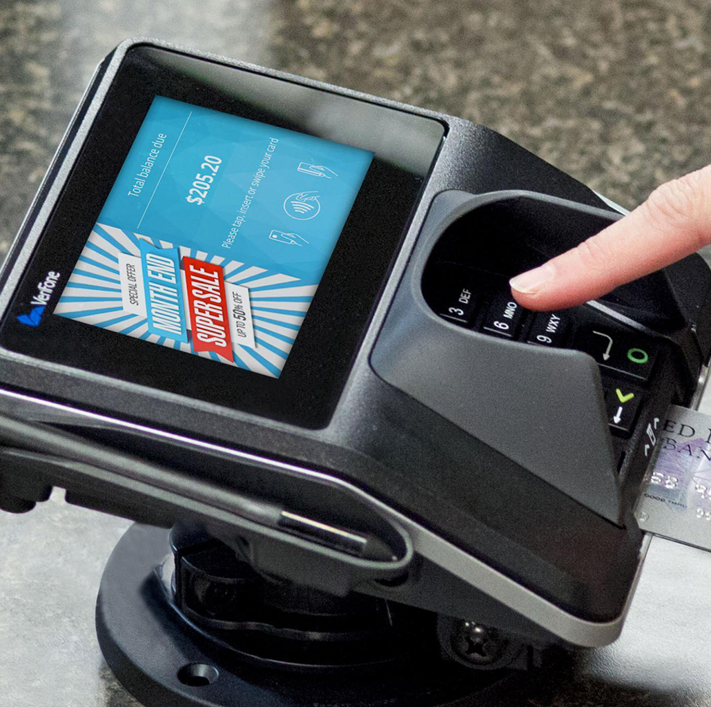 • 4.3″ display area efficiently accommodates optional signature capture along with scrolling account activity, branding and promotional offers